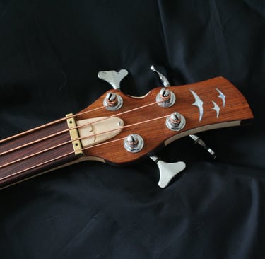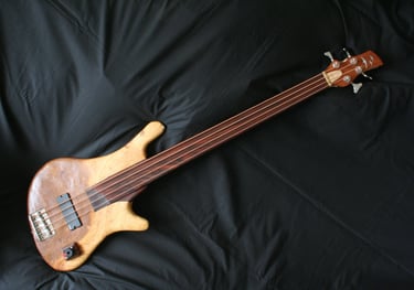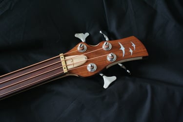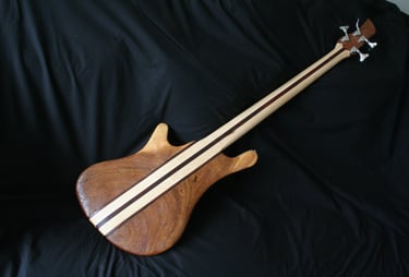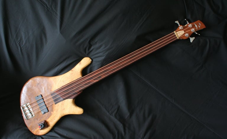One-off commission around a thin piece of African drum wood (max 2.5cm thick), presented pre-cut into a generic bass shape. Wood species unknown.